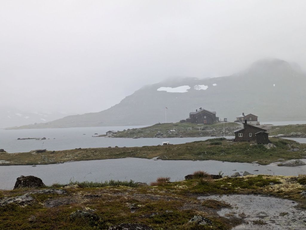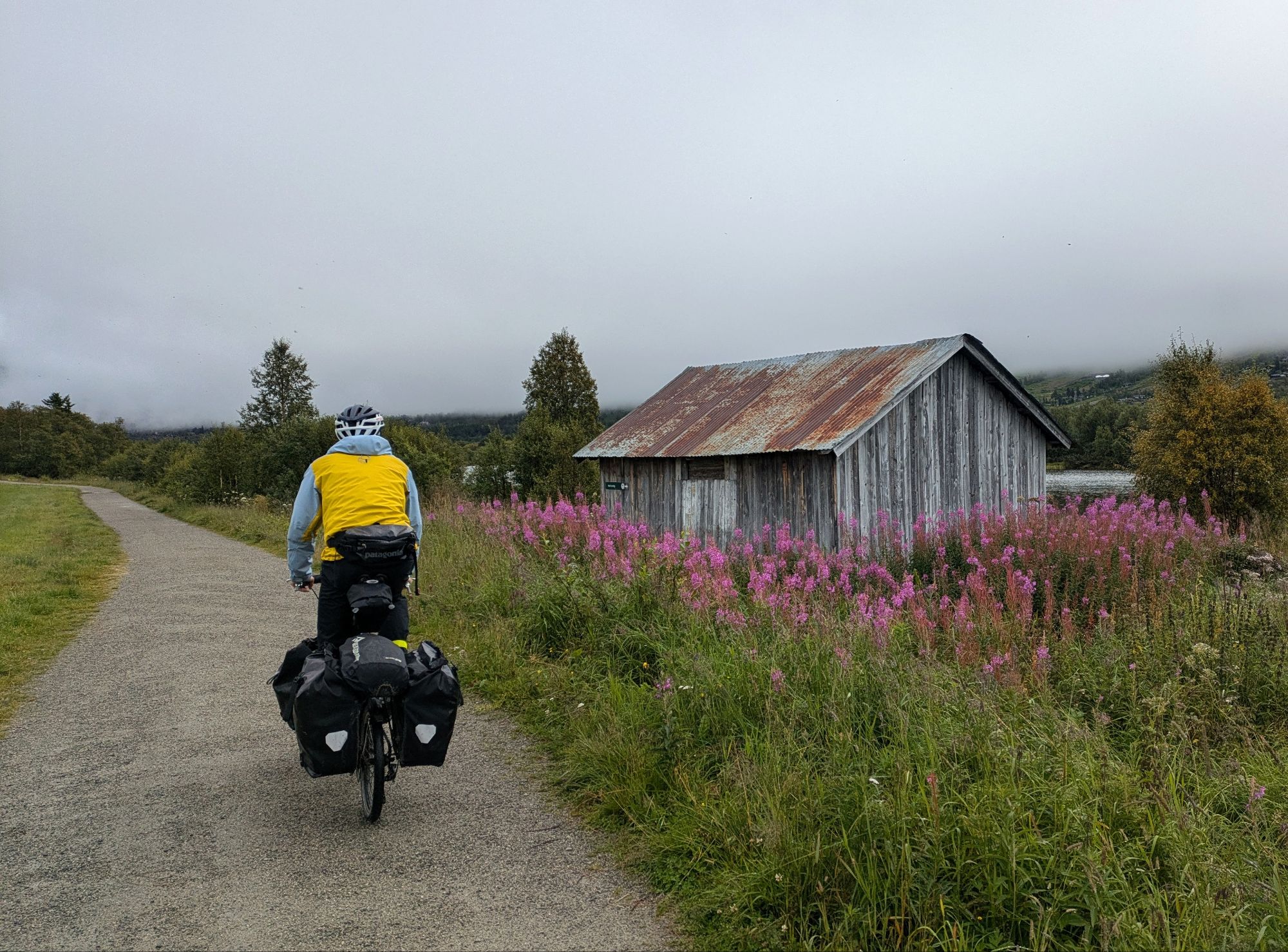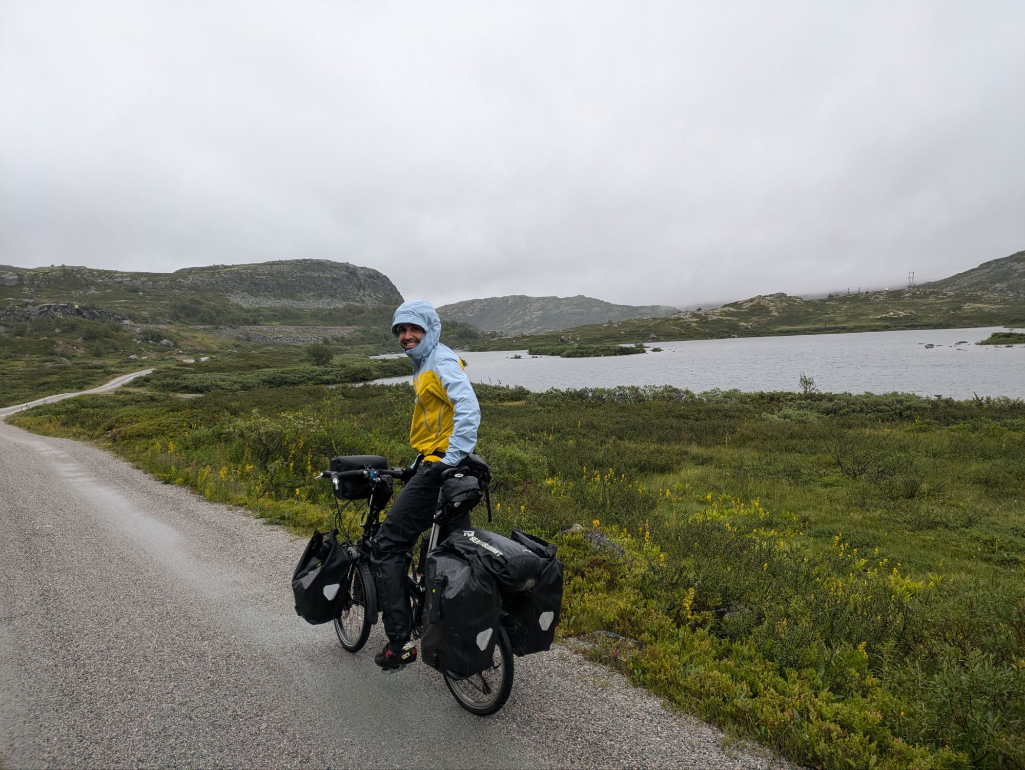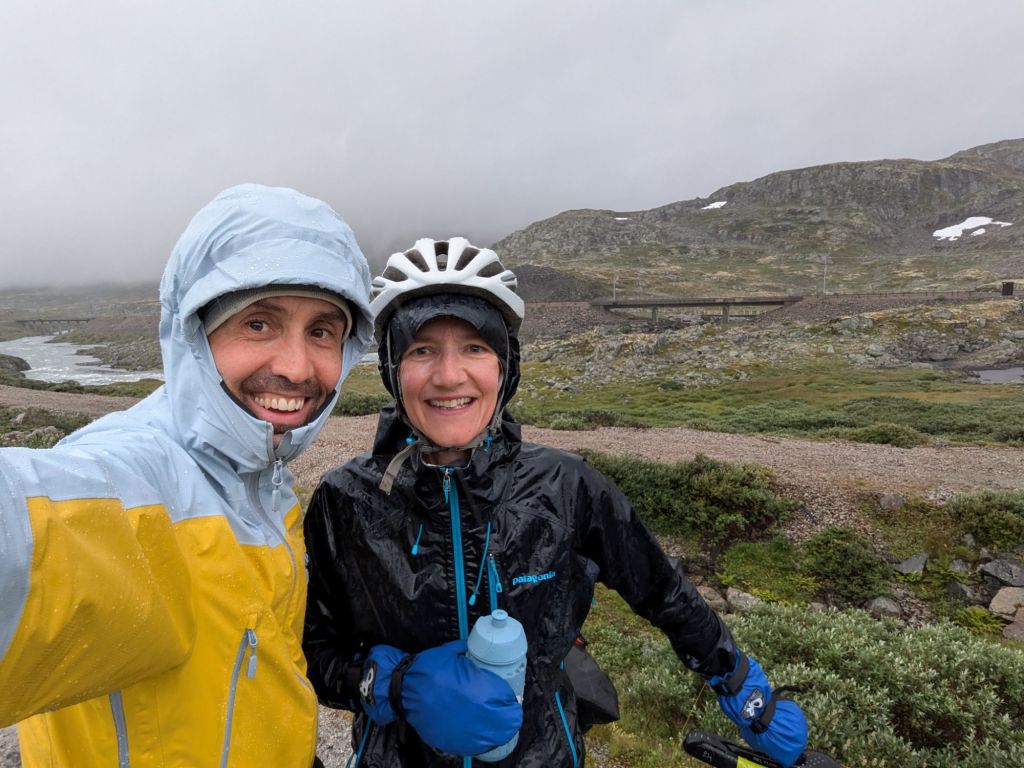 Despite the downpour and heavy winds, the ride along the Rallarvegen is beautiful, at least what we can see if it. It is certainly invigorating and we are thankful for the extra layers our friends Peter and Kasia have lent us. And why do they not need the extra layers? Because, being intelligent and experienced locals, they opt for a cozy morning sipping hot coffee in the hytte before catching the train and meeting us later.