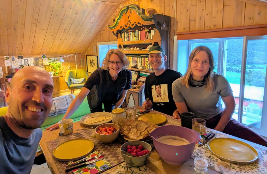 By mid afternoon, we pull into Geilo just as the rain stops. We wring out our gloves and socks and change clothes at a beautiful church that has been transformed into a community center with a daycare, group meeting rooms and a cafe with coffee and pastries sold entirely on the honor system. Peter and Kasia pick us up, toss our muddy bikes into their car and we drive to their home on a farm in Udval, one valley over. We take warm showers and they make a fire to warm us up and help dry out our wet clothes. We enjoy a lovely dinner of salad, pickles, fresh multi grain bread and delicious Norwegian cheese. And for dessert, homemade spelt crepes with whipped cream, honey and fresh berries.