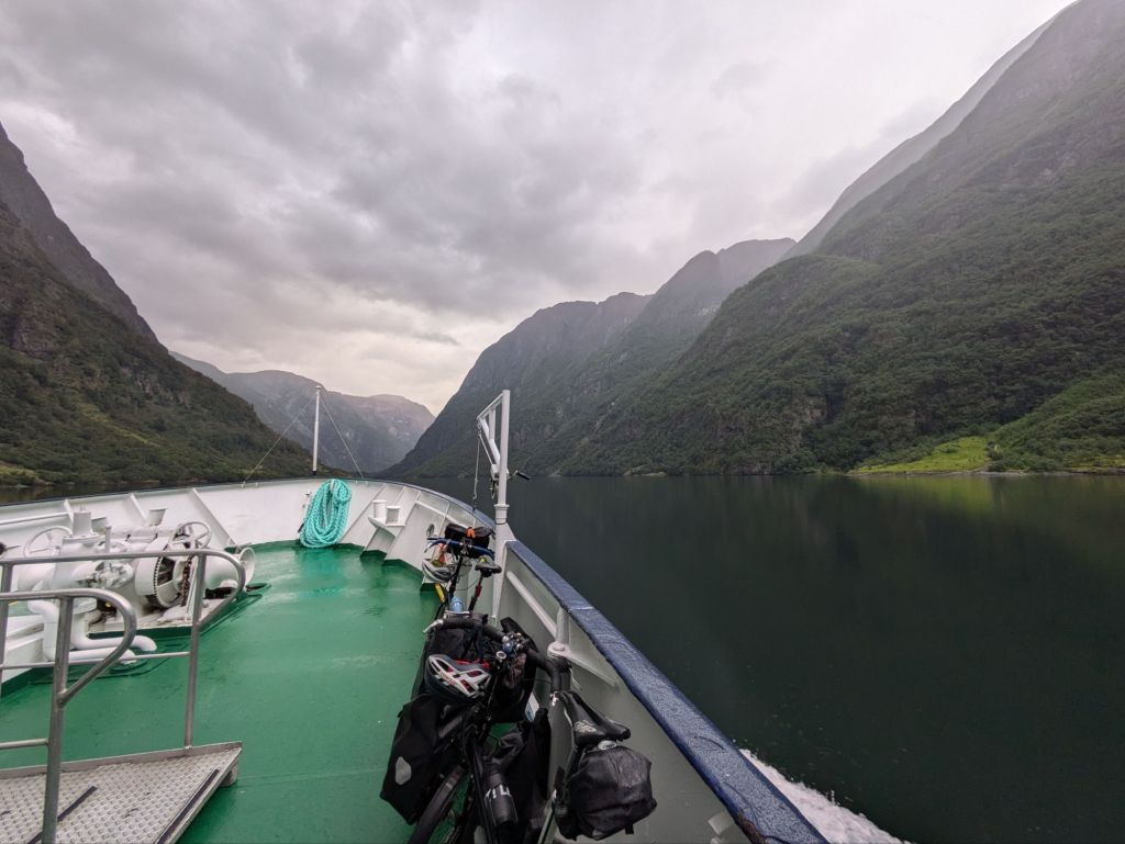 Arriving in Flam, we are disappointed to see a massive cruise ship in the small harbor (ironically painted with #savetheseas on the hull) and maneuver our bikes around the crowds at the bakery and gift shop. A few cruise passengers stroll or ride electric bikes beyond the village harbor but within a few miles of riding we are into the countryside on quiet roads and the start of the Rallarvegen.