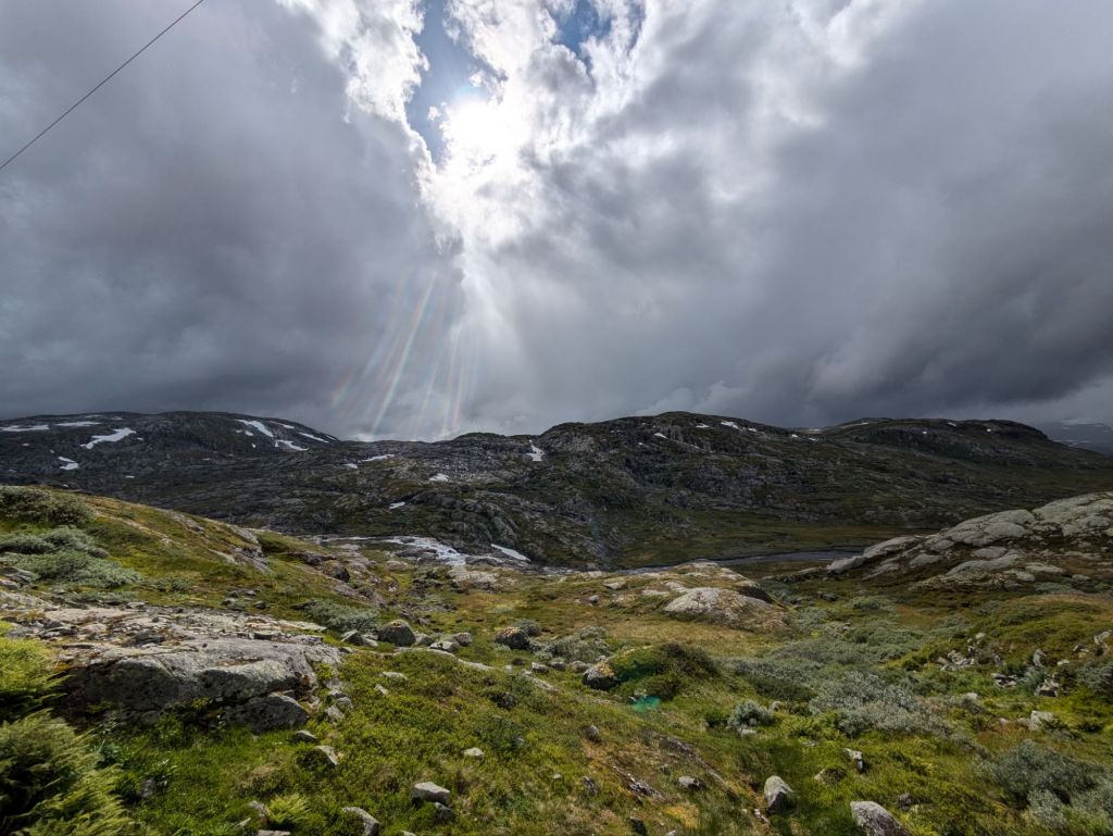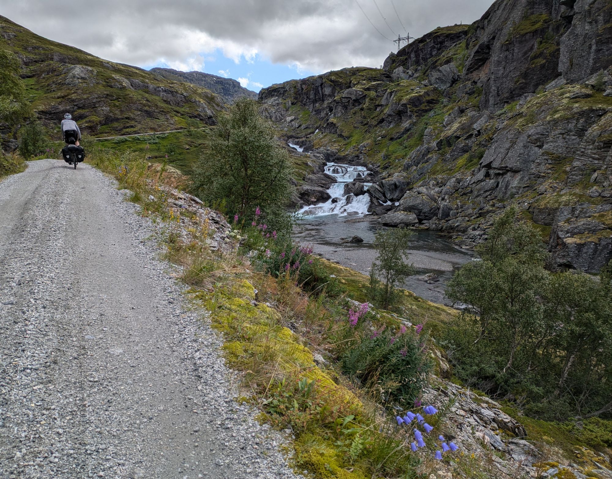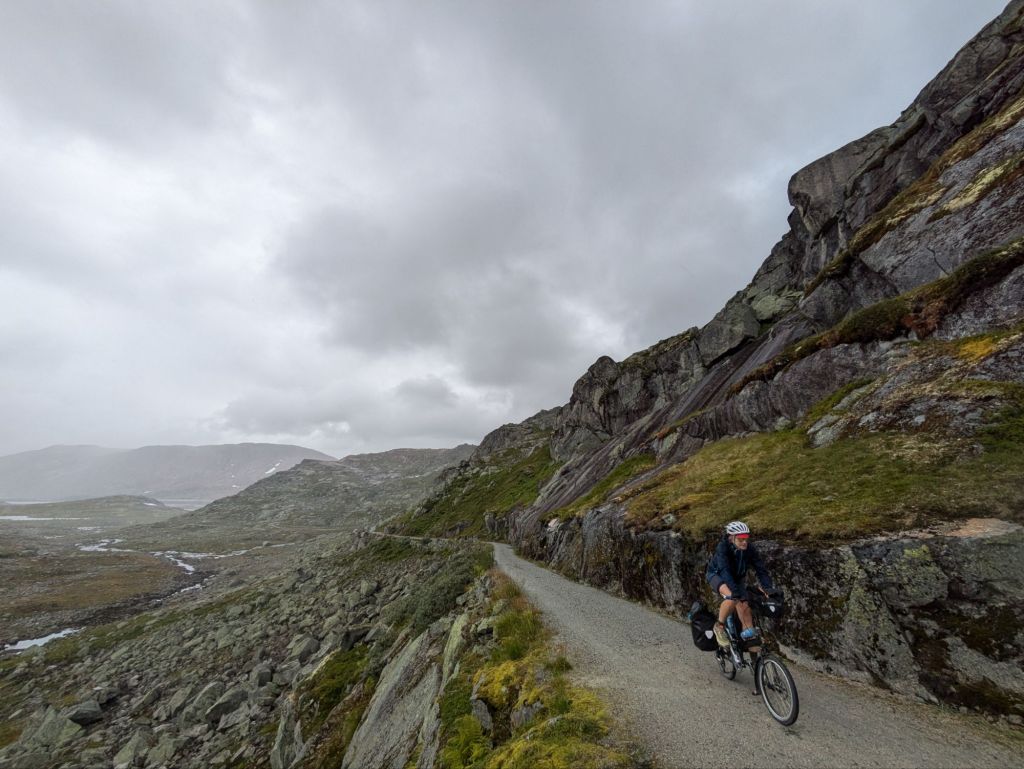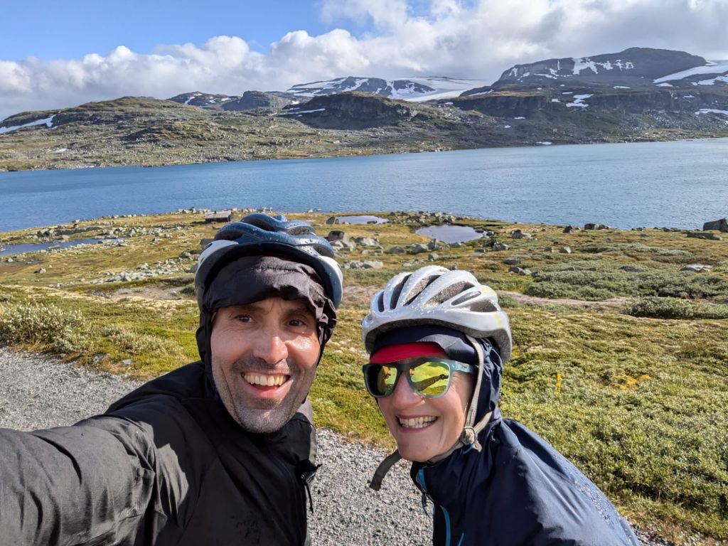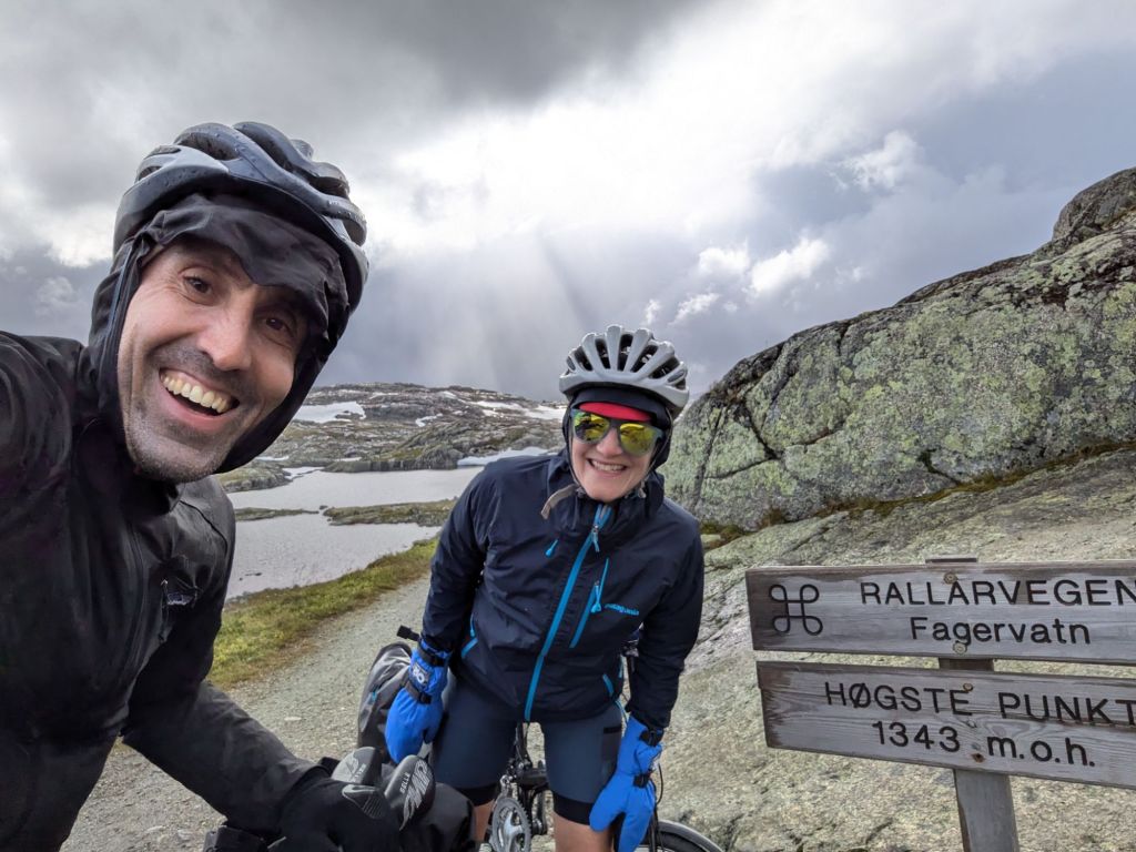 The Rallarvegen is a gravel road that takes us through the mountains of central Norway, from the Aurlandsfjord at sea level through lush green valleys with sheep grazing, past lakes and waterfalls to an alpine landscape of delicate wildflowers and granite boulders at almost 5,000 feet. Just above us are massive glaciers and we get blasts of cold wind whipping off of them. This route served as the access road for construction of the Bergen to Oslo train line at the start of the 1900s and is now a biking and hiking route. It is nothing short of spectacular. Though we get drenched multiple times over the course of the six hour climb and have to throw on all our layers to keep warm, Allegra declares it one of the top five rides of her life.