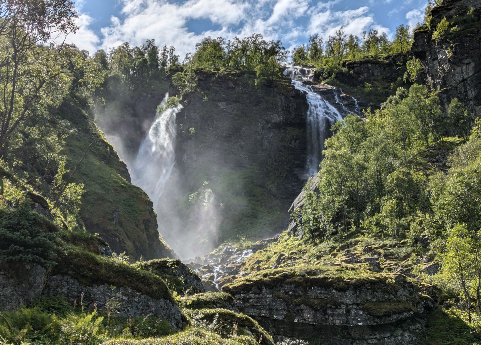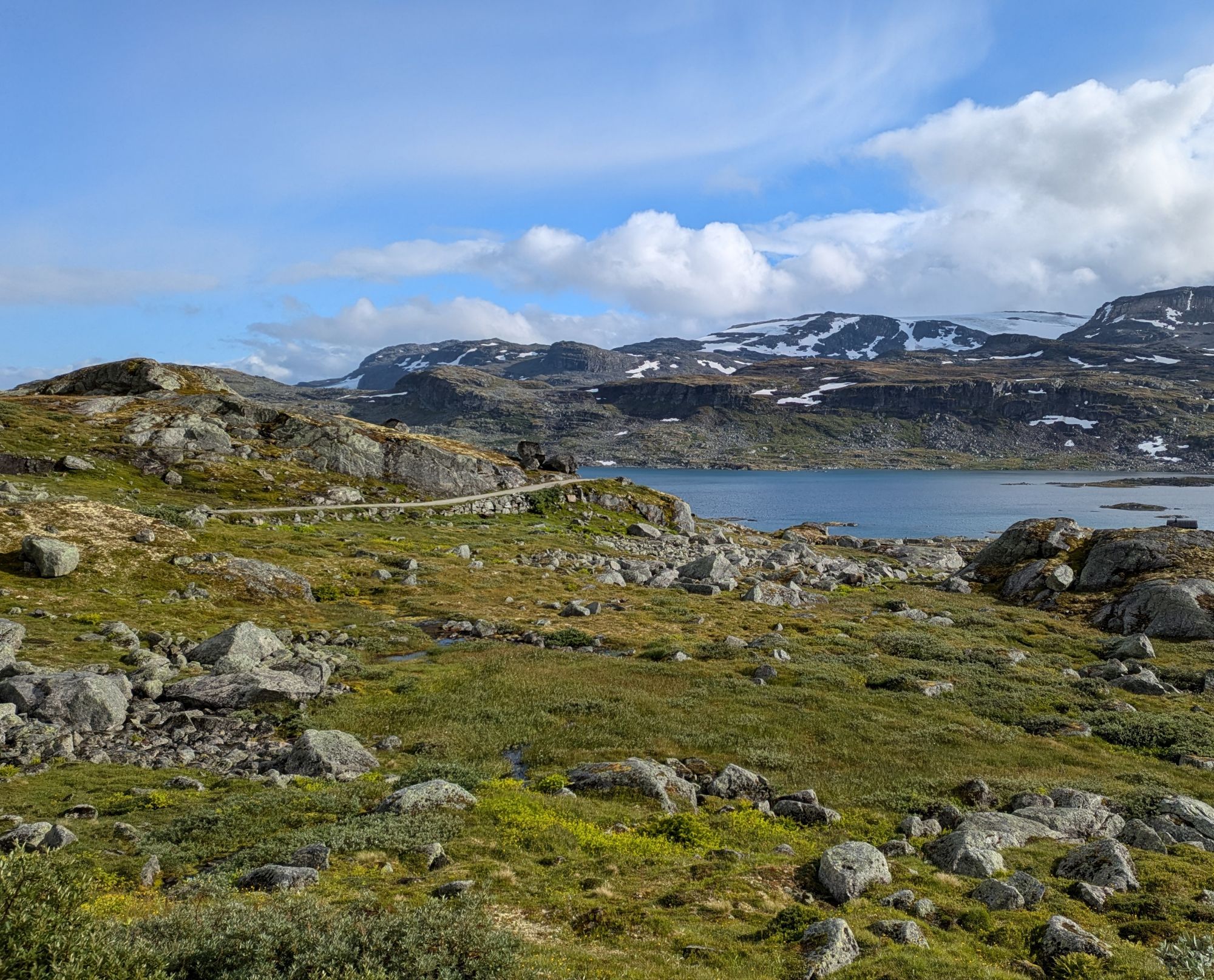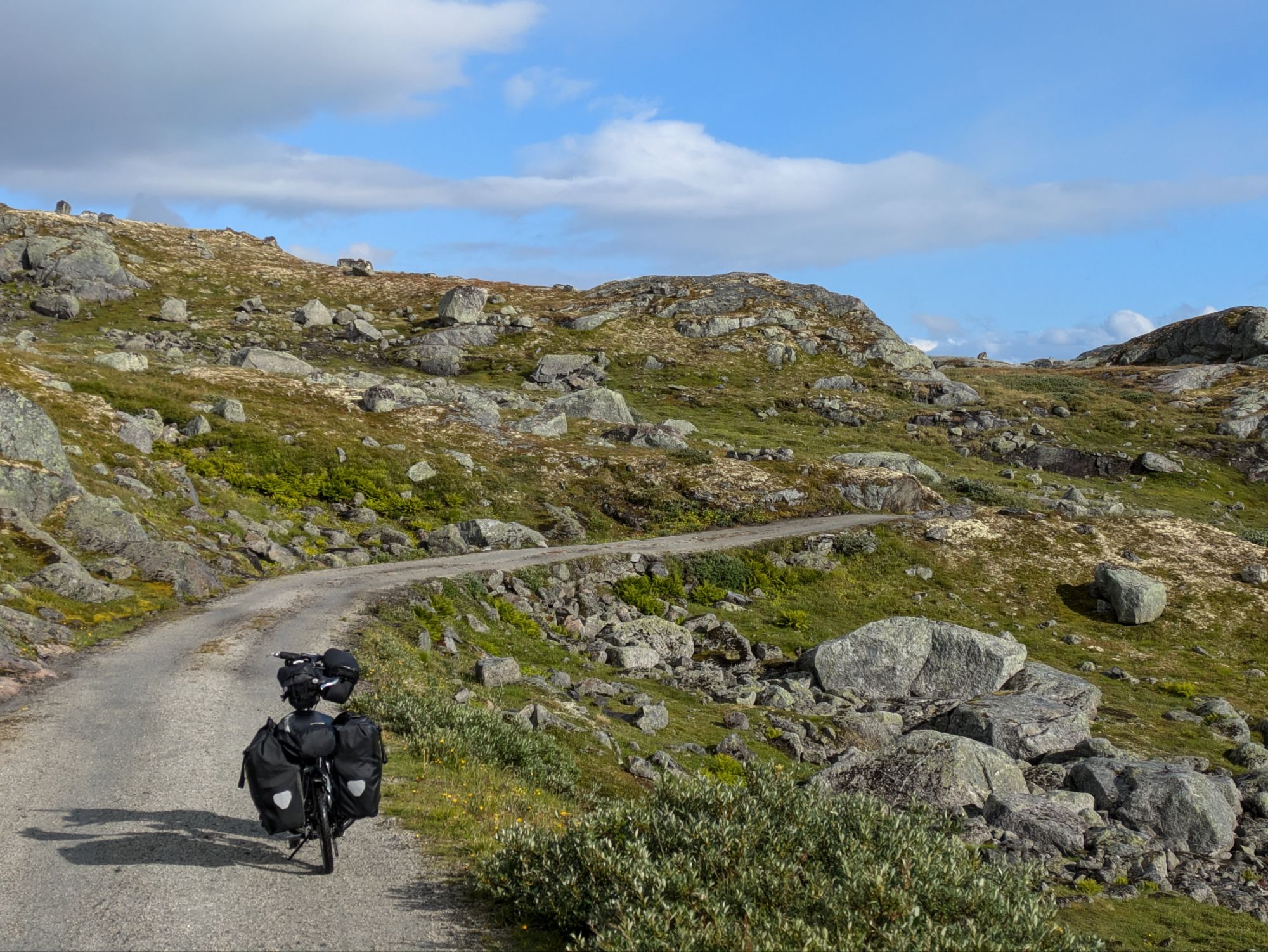 The Rallarvegen is a gravel road that takes us through the mountains of central Norway, from the Aurlandsfjord at sea level through lush green valleys with sheep grazing, past lakes and waterfalls to an alpine landscape of delicate wildflowers and granite boulders at almost 5,000 feet. Just above us are massive glaciers and we get blasts of cold wind whipping off of them. This route served as the access road for construction of the Bergen to Oslo train line at the start of the 1900s and is now a biking and hiking route. It is nothing short of spectacular. Though we get drenched multiple times over the course of the six hour climb and have to throw on all our layers to keep warm, Allegra declares it one of the top five rides of her life.