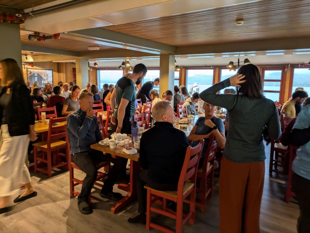 The village of Finse is essentially a train station high in the mountains with one hotel and a hostel (“hytte” or cottage) run by the Norwegian Trekking Association. We arrive at the hytte and pass through a large mud room where people leave their wet gear and into a warm cozy living room where pink cheeked people sit around communal tables in wool base layers and socks, drinking beer and hot chocolate, chatting happily as their kids draw and do puzzles on the floor. The rooms are shared and consist of narrow wooden bunk beds with cubbies to stow gear, shower rooms are down the hall and hearty meals (think potato leek soup and rich cheesy lasagna stuffed with ground beef and a spoonful of sour cream on the side) are served family style with everyone sitting at long tables. It’s warm and convivial yet totally practical and unpretentious in a quintessential Norwegian way.