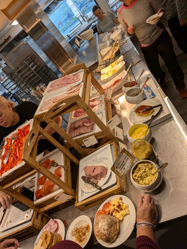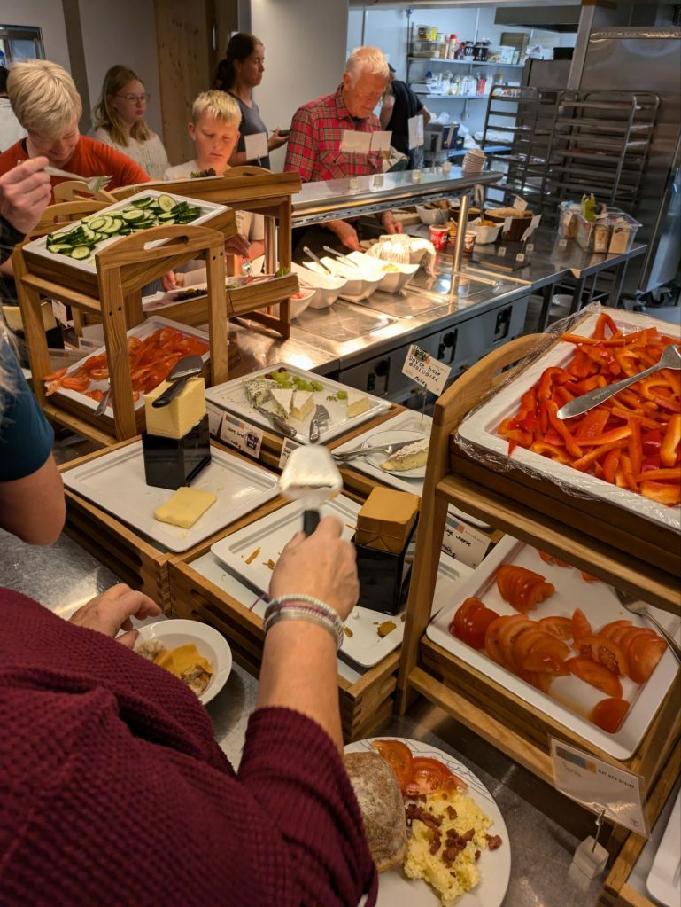 We sleep well and wake up hungry. Fortunately breakfast at the hytte is an event, a massive buffet of fresh breads, yogurt, cheese, musli, oatmeal, eggs, bacon, vegetables, pickled fish and caviar in a tube. People attack the food, loading up plates, and we dive into the scrum. It’s delicious. We notice that practically everyone has grabbed paper maps, which seems antiquated until we realize that the maps are printed on waxed paper and used to wrap up sandwiches to take hiking. It’s brilliant and we make boiled egg, brown cheese and peanut butter and jam sandwiches for the road. It’s dumping rain with 20 mph winds, but we bundle up and head out the door.