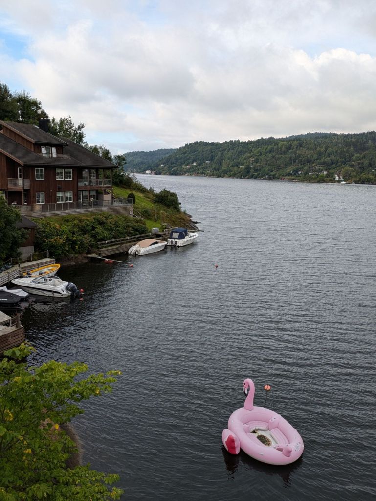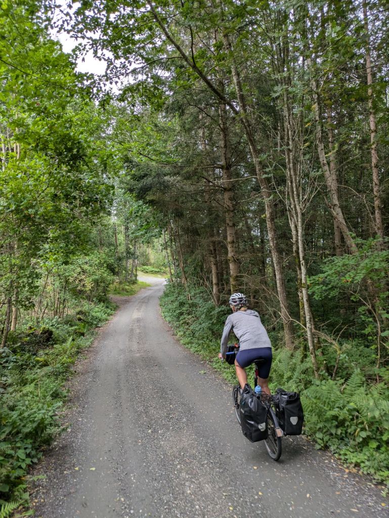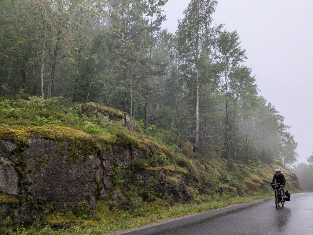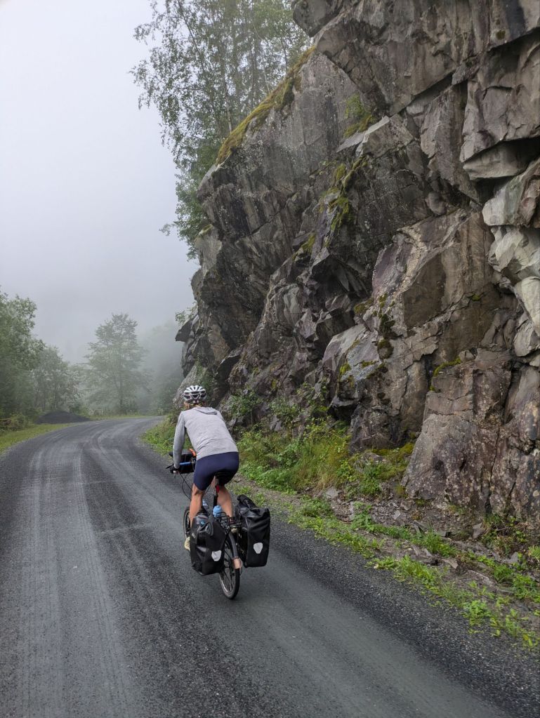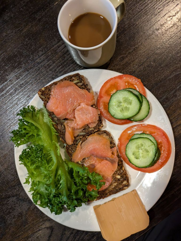 We reach Skien at 7 pm, after 10+ hours of riding, tired and hungry, and find a hotel that delivers perfectly. Our room has a beautiful view of the end of the Telemark Canal, the water in the shower is hot and dinner and breakfast are included. We eat well and fall asleep. In the morning, we enjoy the Norwegian breakfast of champions: fresh multi grain bread full of sunflower seeds, salmon gravalox with tomato, cucumber and lettuce. It’s delicious. For good measure we have musli too.