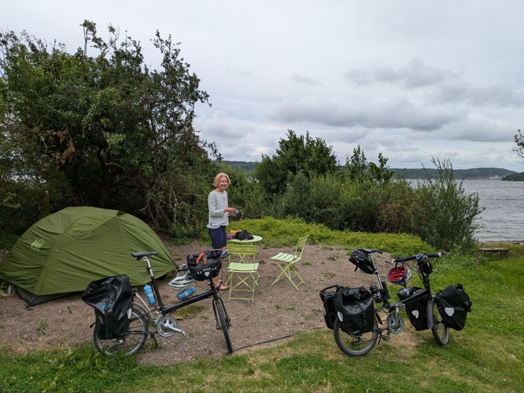There are camper vans and tents and a few small buildings overlooking the water. One says reception but we poke out heads in and nobody is there. We sit outside for a few minutes trying to decide what to do when a tall, bald, well-tanned and completely stark naked Norwegian man strolls up from the fjord with a friendly smile and asks if we want to camp. We say yes but are obviously a bit confused. The man is quite easy going and explains that we are at a nudist campground. It turns out that the description we read on the ferry was not for a “nature preserve” but for a “naturist preserve.” Very different. But we are here now and he walks us (naked) down to a beautiful camping spot on the fjord next to an apple tree and a petanque court. Two nights ago we were at a hotel with a dress code for dinner and tonight at a nudist camp. We can only laugh as we set up our tent. What an adventure.