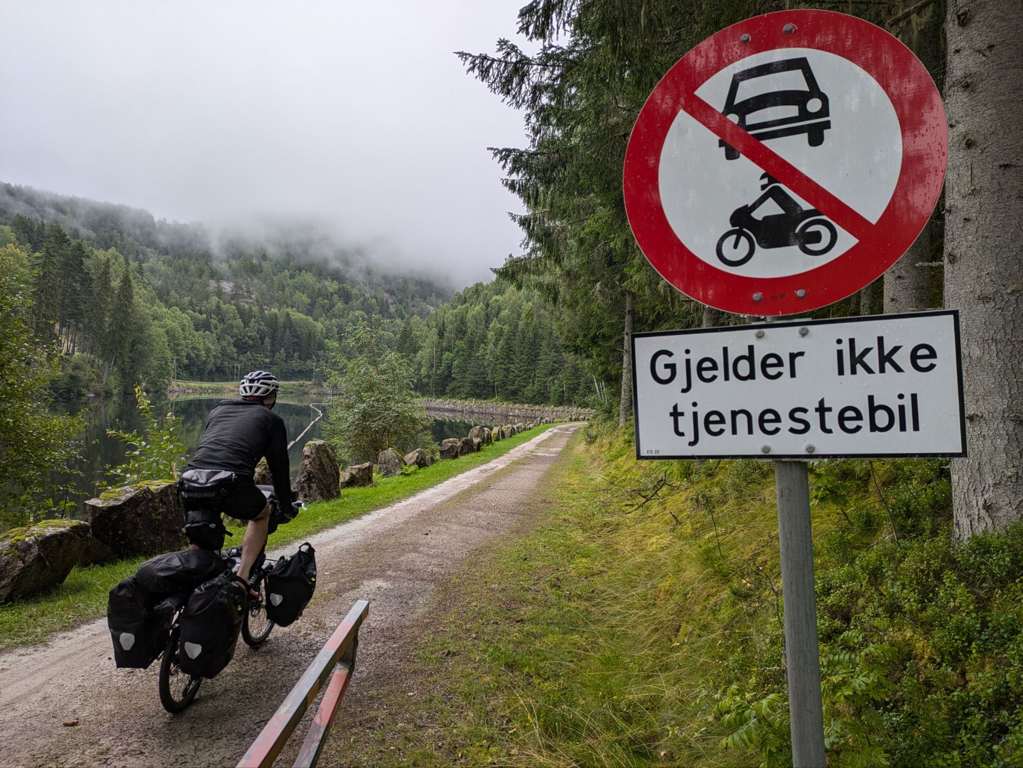 The Telemark Canal connects the towns of Dalen and Skien by linking several long lakes in the Skien watershed through a series of 18 locks. It is a magical area, with narrow gravel and paved roads hugging the shores of the pristine lakes and winding through the steep mountains. Dalen to Skien is 150 kilometers and we decide to do it in one go, as the weather forecast is positively Norwegian – light rain, wind, drizzle, maybe a sun break here and there followed by a downpour, etc. – and we prefer not to wild camp in the pouring rain. After a great night of sleep, we do serious damage to the Dalen Hotel breakfast buffet (no dress code!) before hopping on our bikes: bowls of musli with hazelnuts and dates, homemade multi grain bread, cheese and yogurt, fresh fruit and jam, omelettes made with eggs from the resident chickens and two big carafes of coffee. Well fueled, we spin happily out of Dalen along the shore of Bandak Lake and into the woods.