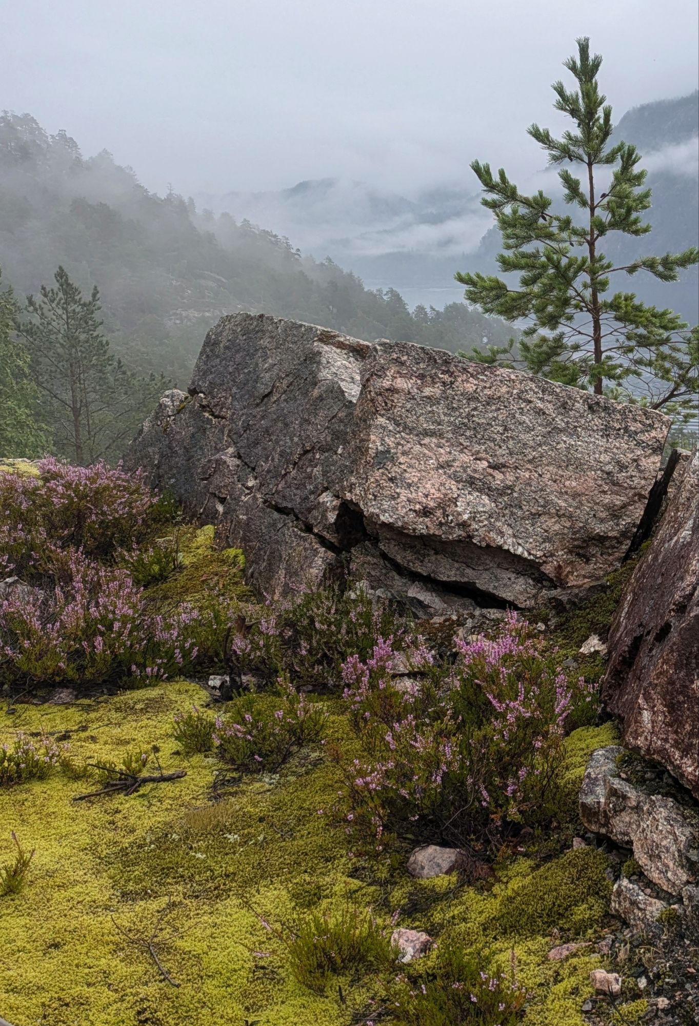 The rain holds off for a few hours and through the whispy low lying clouds we see steep mountains rising steeply from the water. The moisture in the air accentuates the green of the pastures, trees, ferns, lichen, heather and moss.