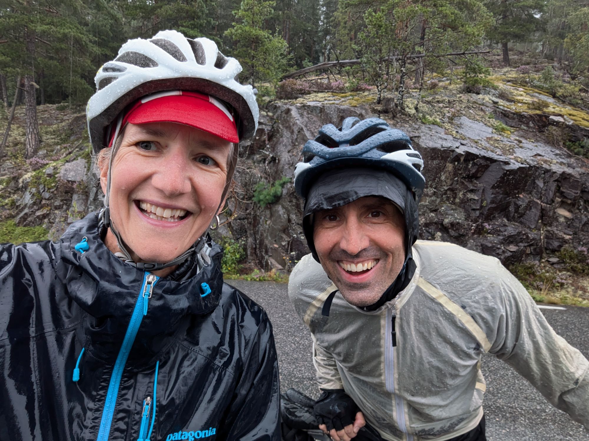 The rain begins in earnest at around 11. It’s torrential and chilly. I am wearing a wool base layer, wool sweater, wool hat, a Patagonia hooded windbreaker and a cycling rain jacket and I am still soaked and cold, though it’s fine as long as we keep moving.