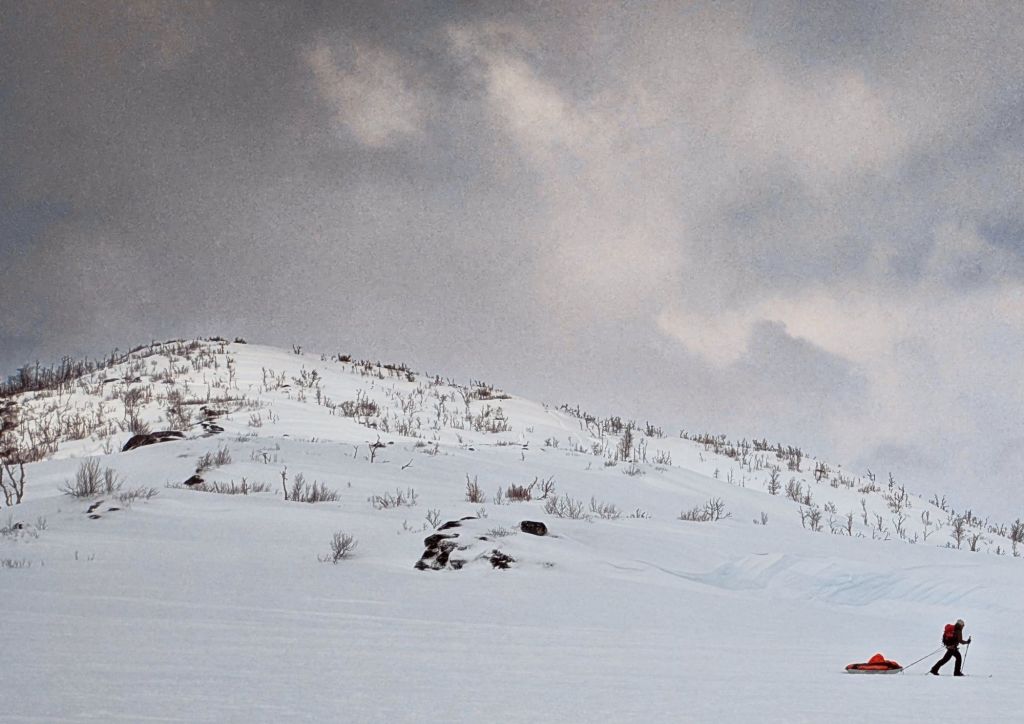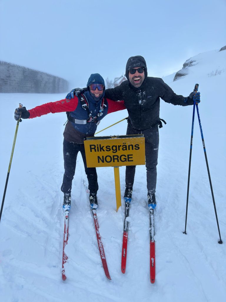 We ski from our hostel to the Norwegian border. It’s not far, but in typical fashion the wind is whipping and heavy snow is falling. We’ve crossed Finland and Sweden and the fjords of Norway are just down the hill.