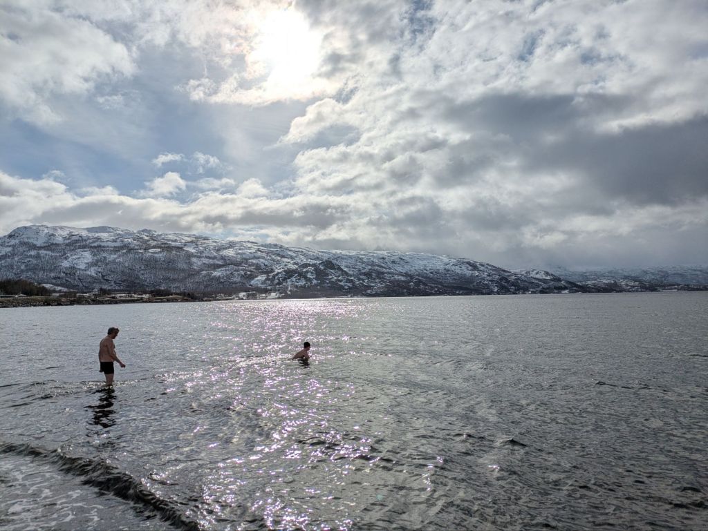 Appropriately, a couple of hearty Finns take a celebratory plunge in the fjord.