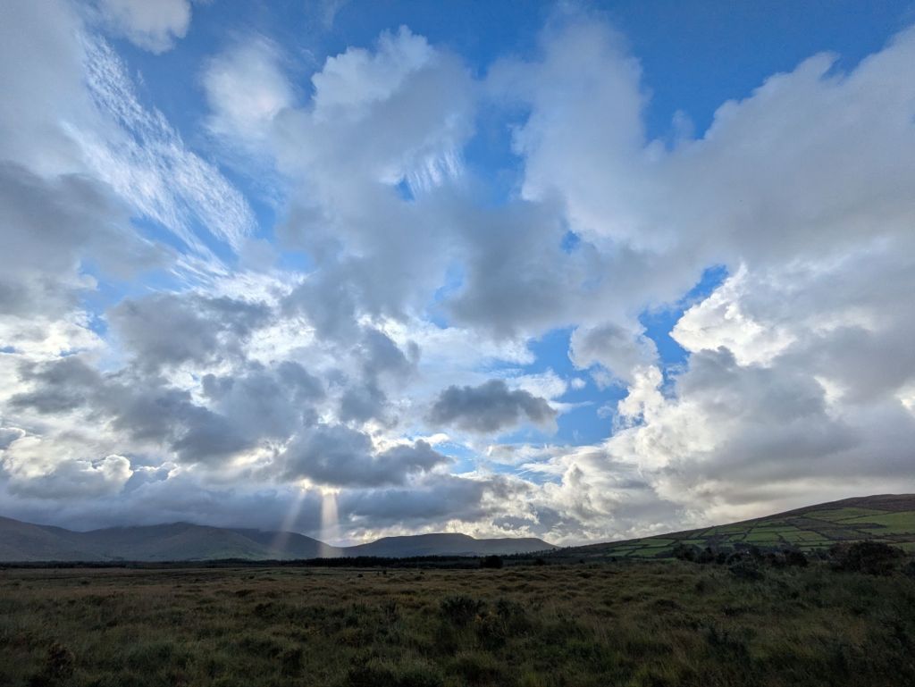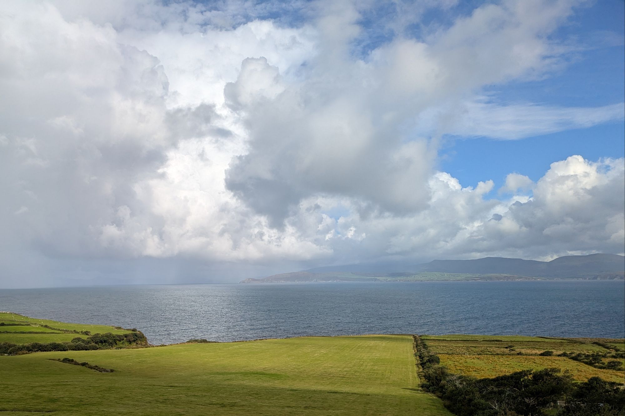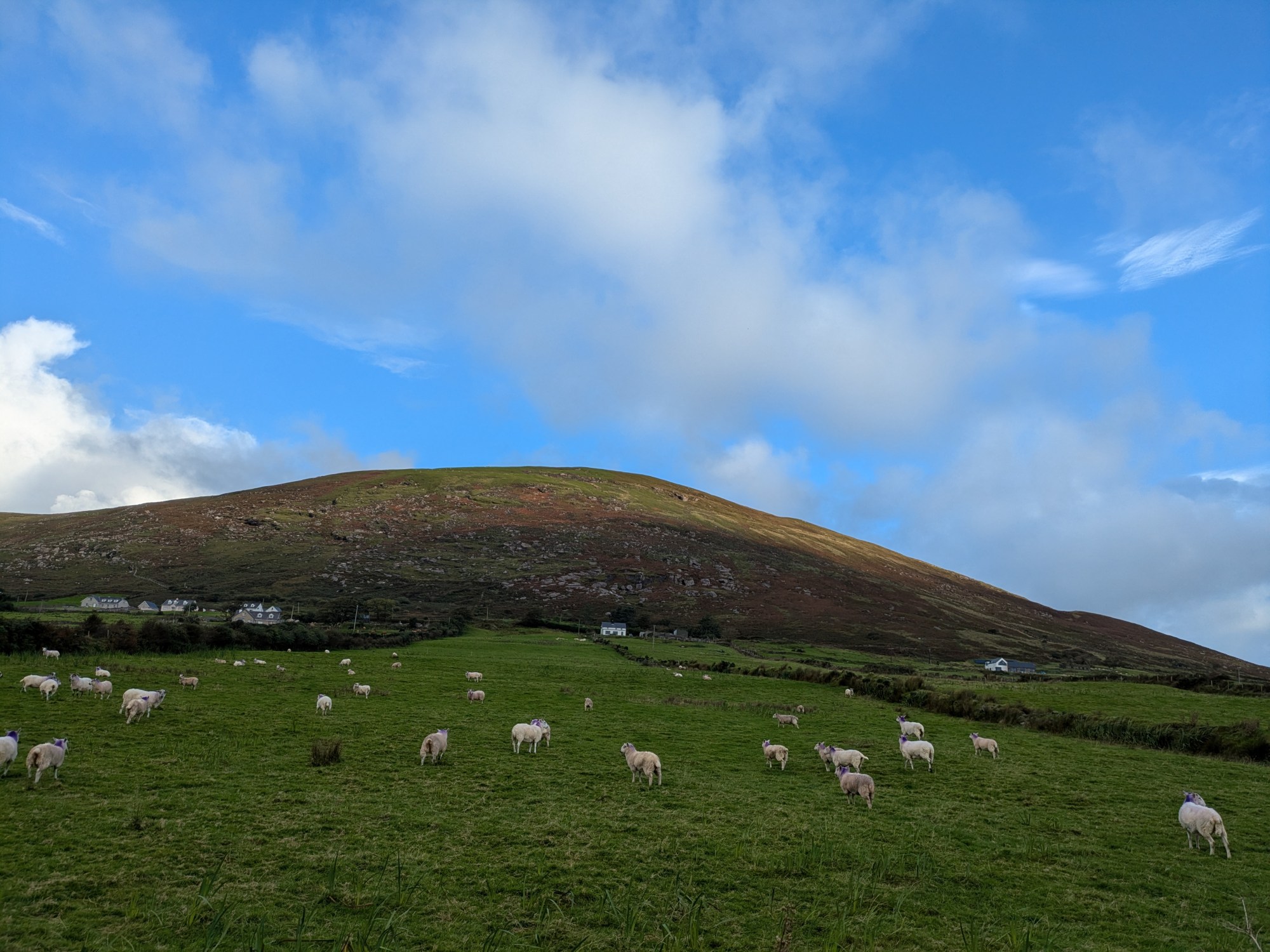 To say that the weather in western Ireland is dynamic is to substantially understate matters. Dramatic often feels like the right word, and in cases like today, erratic and tempestuous might be more accurate. Between bursts of heavy rain, gusts of wind off the North Atlantic and beautiful sun breaks, today has it all. Our ride takes us around the wide Dingle Bay and Castlemaine Harbor. From start to finish, it’s about 20 km as the crow flies and 110 km cycling along narrow and winding country roads that drop down to the ocean and back up into the hills, past sheep and dairy farms.
