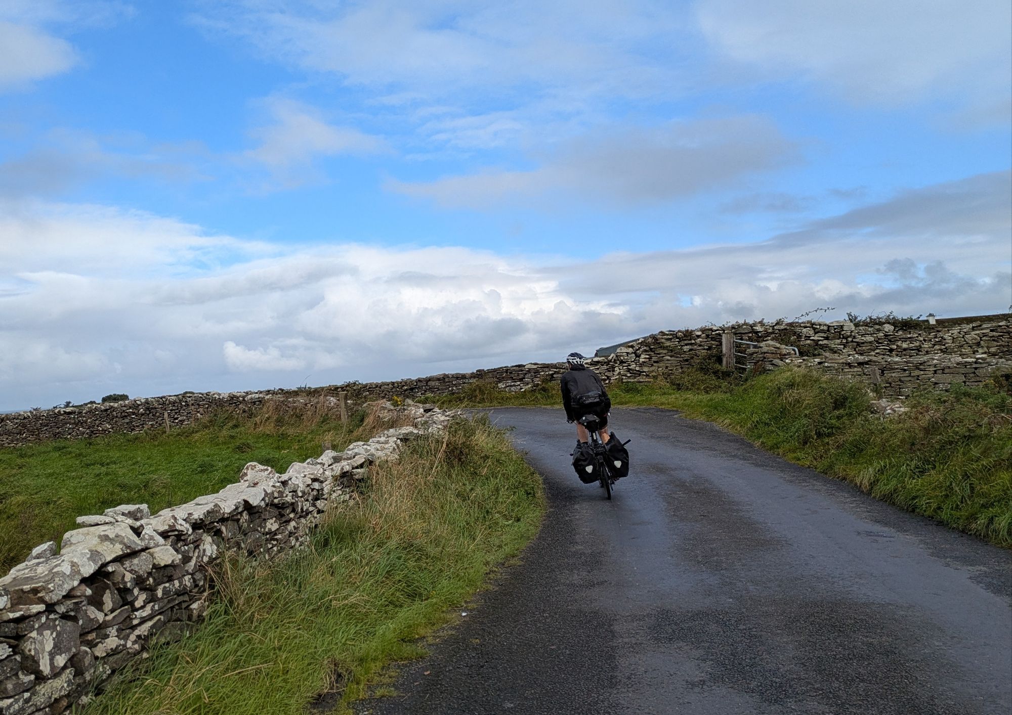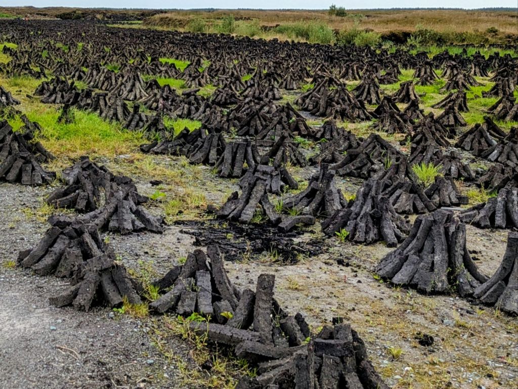 Further up the road, we see evidence of small scale peat harvesting. The carbon-rich soil, which comes from peat bogs, is dug up and then dried in small piles before being burned for heating fuel. It’s being phased out as Ireland moves to conserve its peatlands and protect its sensitive water systems, but we still smell the heavy and oily peat smoke as we ride through small villages and further down the road see a group of young men cracking jokes and throwing dried peat briquettes into a tractor trailer. In the distance are wind turbines.