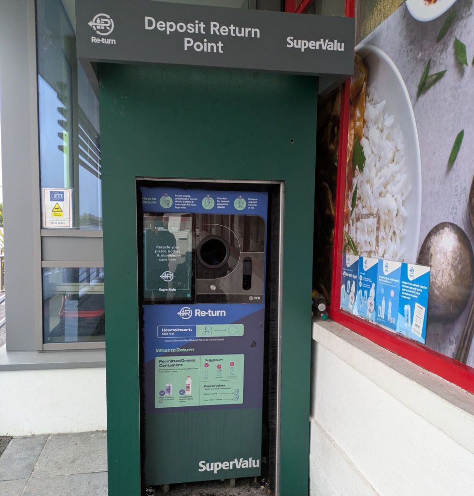 On days like today, we try to just keep going, so lunch consists of a quick stop under the eves of a SuperValu grocery store, where we wolf down sandwiches and chat with a friendly couple dutifully returning their recyclables for store credit at an automated kiosk. At 15 cents per returned container, very little trash gets tossed on the roadside in Ireland.