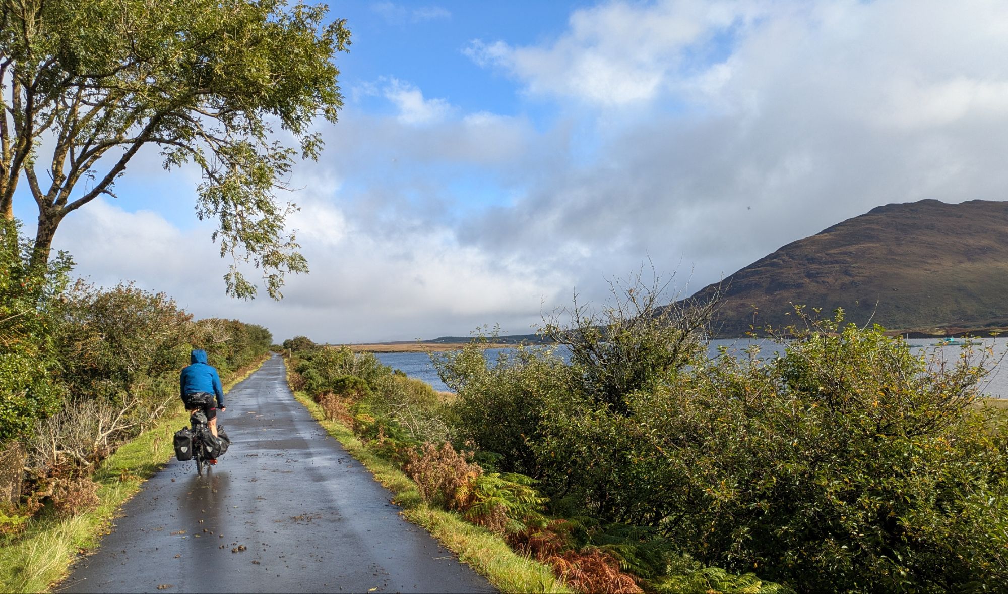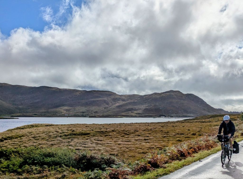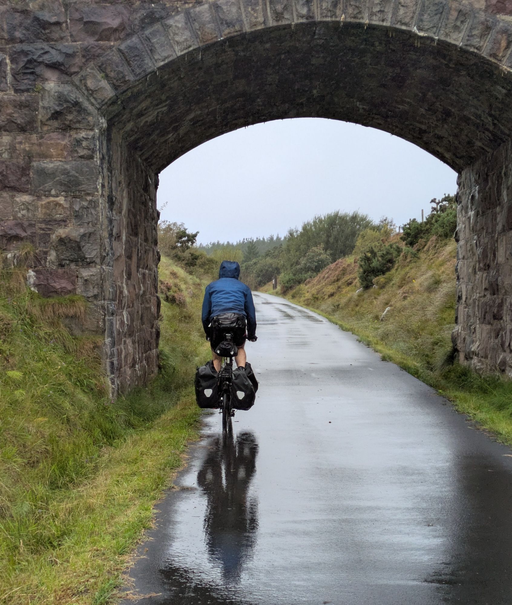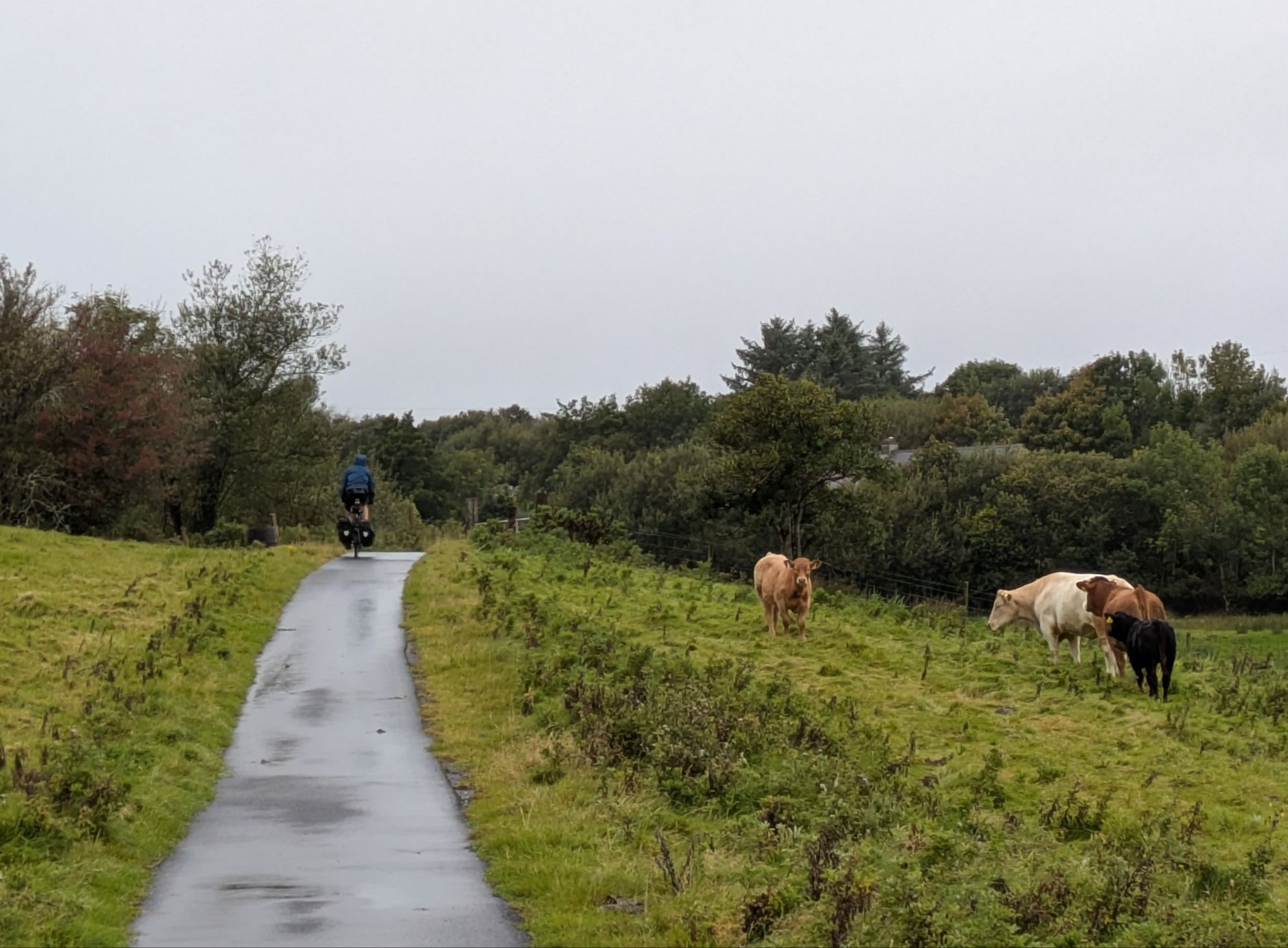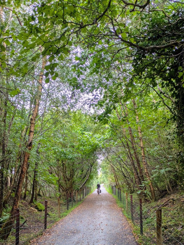 Today’s weather is nothing short of the Full Irish, a soaking wet and windy day as we ride along the Great Western Greenway, a former rail line turned cycling path. The trail infrastructure is excellent and the route is gorgeous, from what we can tell peering out from under our raincoats. During rain breaks, we do catch a few glimpses of the Nephin Beg Mountains in the distance, part of the Wild Nephin National Park, which we will traverse in a few days.